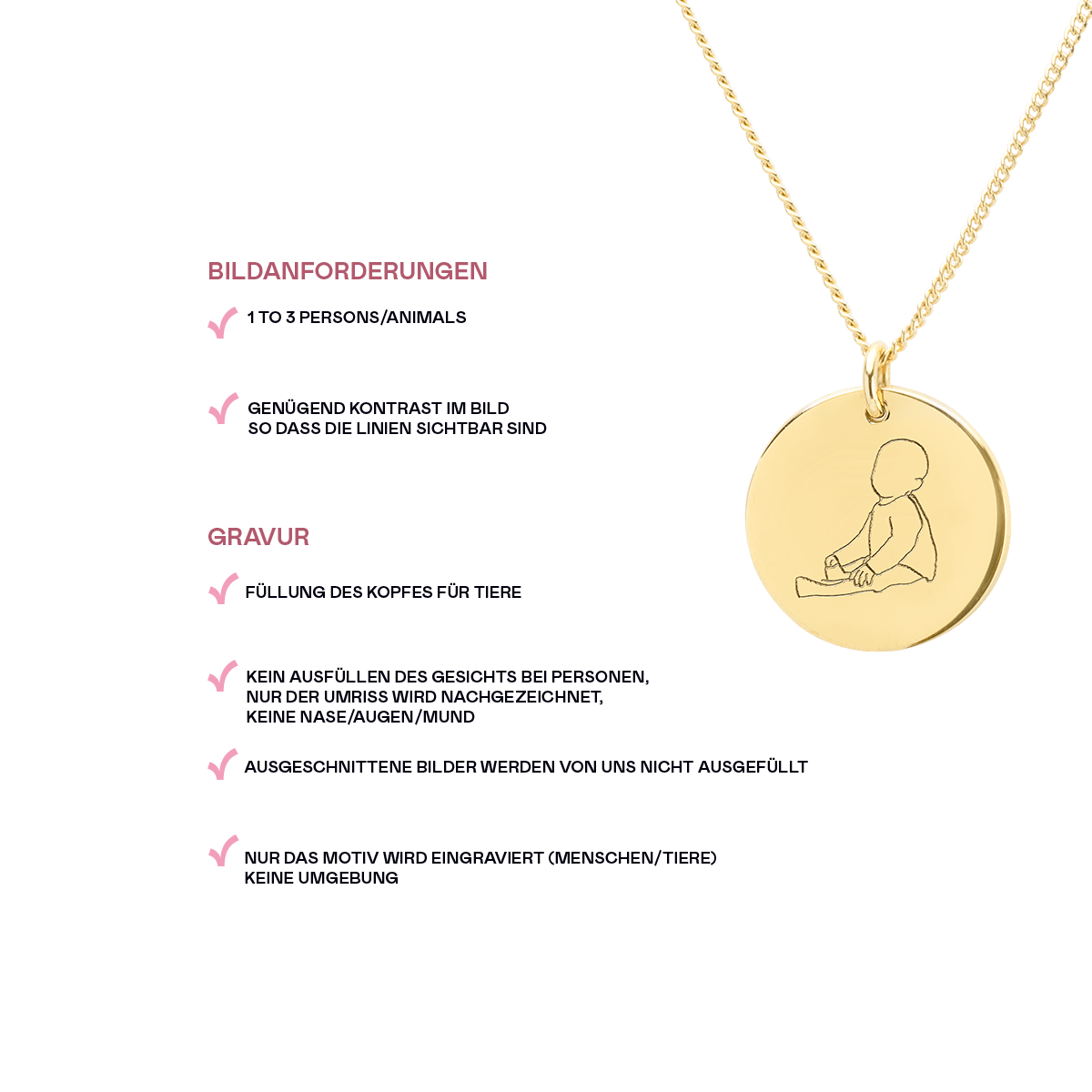 Mit der Photo Line Coin Kette können Sie die schönsten Erinnerungen festhalten und auf eine Münze gravieren lassen. Ein wertvolles Foto, das Sie an einen schönen Moment erinnert, können Sie nun auf dieser Halskette für immer bei sich tragen. Gravieren Sie 1 bis 3 Personen oder Tiere, denken Sie an ein Foto Ihrer Eltern, Ihrer besten Freundin, Ihres süßen Hundes oder Ihres Kindes!
